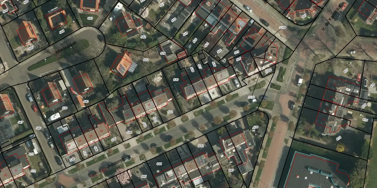 Het perceel waarop Jupiterstraat 12 staat heeft een oppervlakte van 292 m². Dit is een middelgroot perceel. De perceeloppervlakte wordt geregistreerd door het Kadaster. Gedetailleerde informatie over de maten van dit perceel kunt u vinden in het rapport Kadastrale kaart met maatvoering van Jupiterstraat 12.