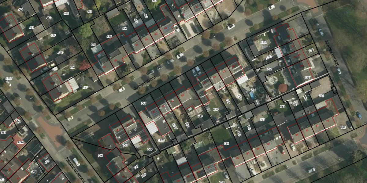 Het perceel waarop Jupiterstraat 89 staat heeft een oppervlakte van 325 m². Dit is een groot perceel. De perceeloppervlakte wordt geregistreerd door het Kadaster. Gedetailleerde informatie over de maten van dit perceel kunt u vinden in het rapport Kadastrale kaart met maatvoering van Jupiterstraat 89.