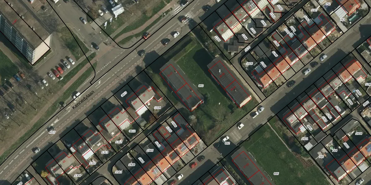 Het perceel waarop Kennedylaan 33 staat heeft een oppervlakte van 2080 m². Dit is een zeer groot perceel. De perceeloppervlakte wordt geregistreerd door het Kadaster. Gedetailleerde informatie over de maten van dit perceel kunt u vinden in het rapport Kadastrale kaart met maatvoering van Kennedylaan 33.
