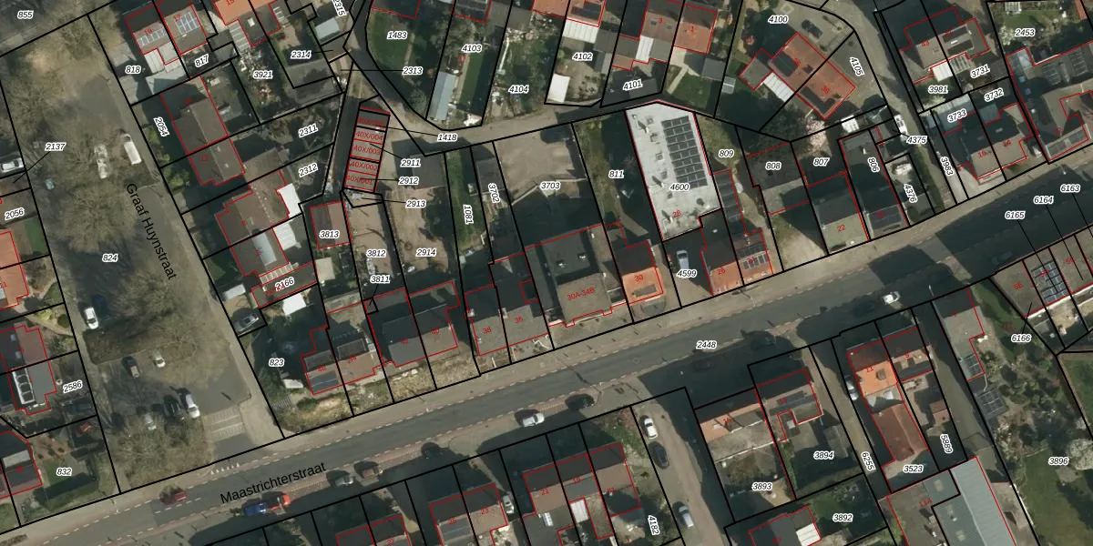 Het perceel waarop Maastrichterstraat 34-A staat heeft een oppervlakte van 595 m². Dit is een groot perceel. De perceeloppervlakte wordt geregistreerd door het Kadaster. Gedetailleerde informatie over de maten van dit perceel kunt u vinden in het rapport Kadastrale kaart met maatvoering van Maastrichterstraat 34-A.