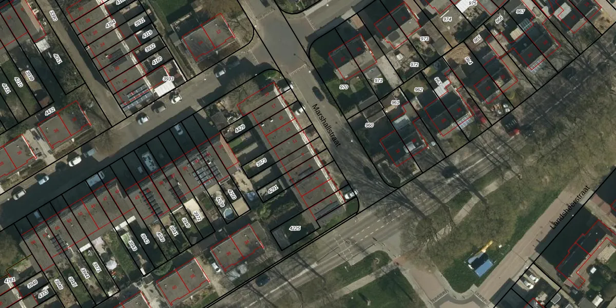 Het perceel waarop Marshallstraat 9 staat heeft een oppervlakte van 3533 m². Dit is een zeer groot perceel. De perceeloppervlakte wordt geregistreerd door het Kadaster. Gedetailleerde informatie over de maten van dit perceel kunt u vinden in het rapport Kadastrale kaart met maatvoering van Marshallstraat 9.