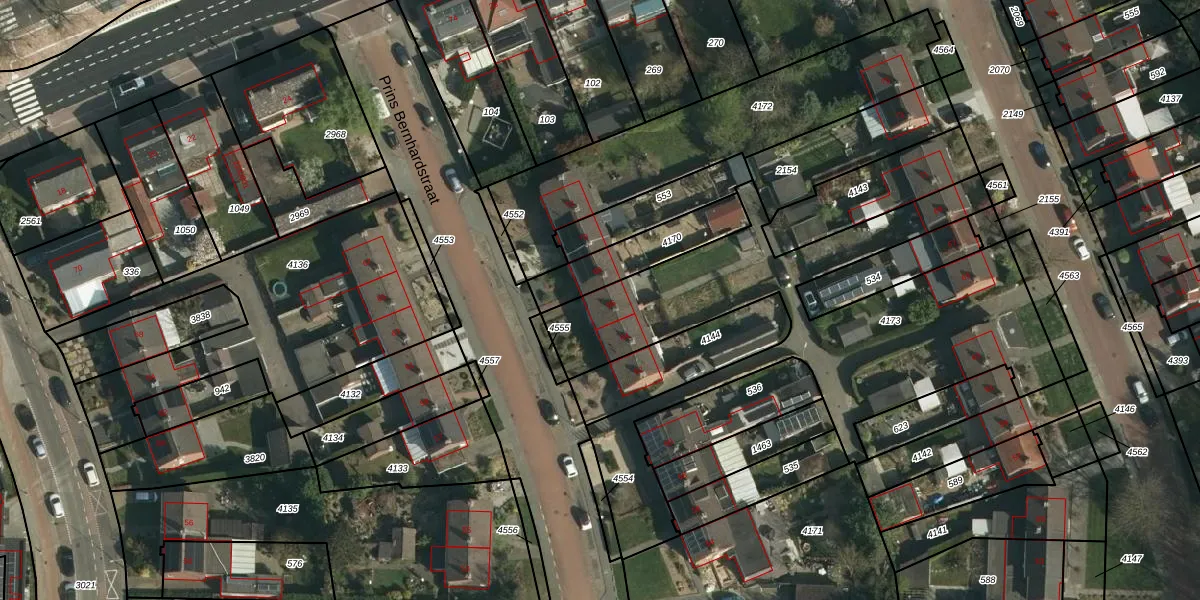 Het perceel waarop Prins Bernhardstraat 66 staat heeft een oppervlakte van 1750 m². Dit is een zeer groot perceel. De perceeloppervlakte wordt geregistreerd door het Kadaster. Gedetailleerde informatie over de maten van dit perceel kunt u vinden in het rapport Kadastrale kaart met maatvoering van Prins Bernhardstraat 66.