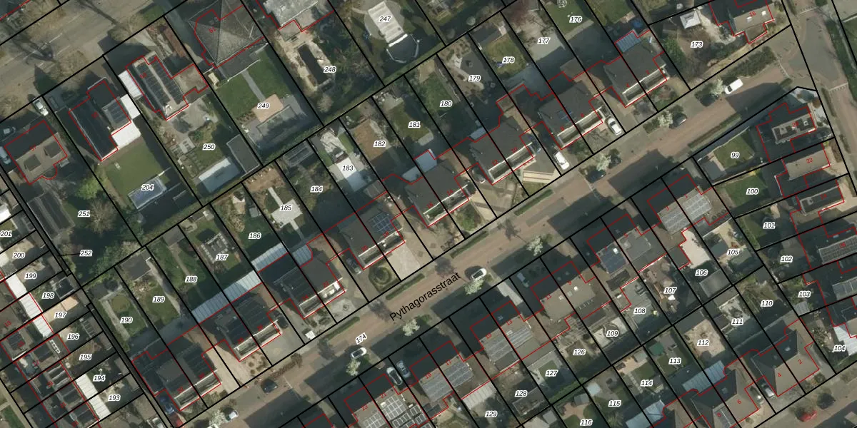 Het perceel waarop Pythagorasstraat 16 staat heeft een oppervlakte van 361 m². Dit is een groot perceel. De perceeloppervlakte wordt geregistreerd door het Kadaster. Gedetailleerde informatie over de maten van dit perceel kunt u vinden in het rapport Kadastrale kaart met maatvoering van Pythagorasstraat 16.