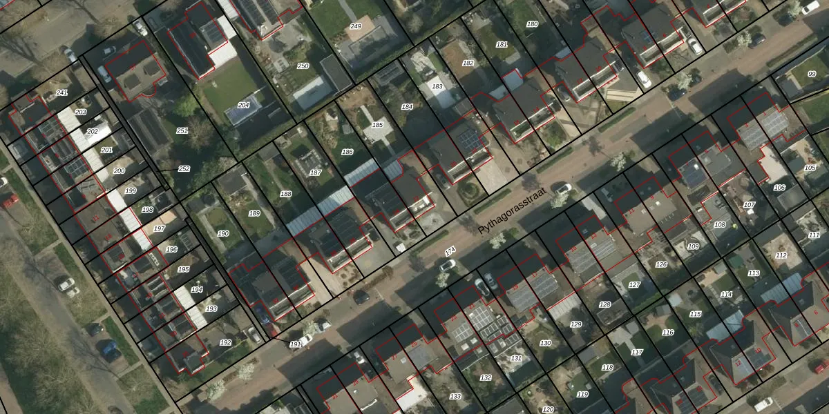 Het perceel waarop Pythagorasstraat 22 staat heeft een oppervlakte van 361 m². Dit is een groot perceel. De perceeloppervlakte wordt geregistreerd door het Kadaster. Gedetailleerde informatie over de maten van dit perceel kunt u vinden in het rapport Kadastrale kaart met maatvoering van Pythagorasstraat 22.