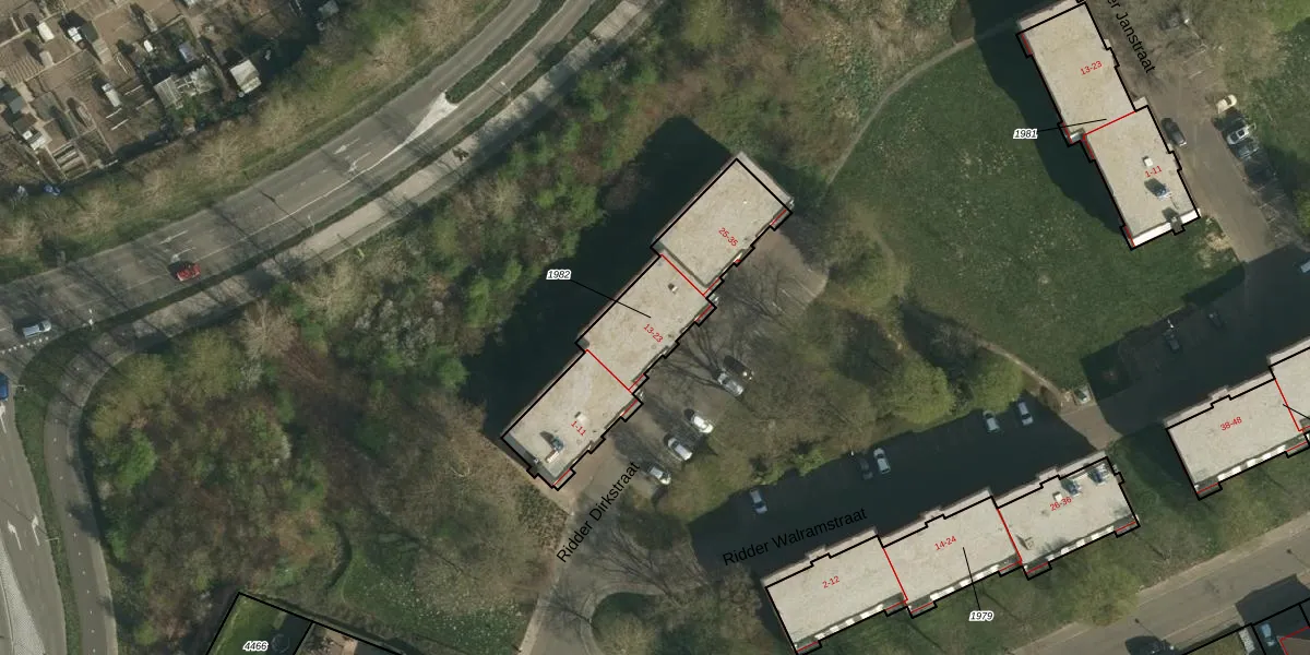Het perceel waarop Ridder Dirkstraat 21 staat heeft een oppervlakte van 627 m². Dit is een groot perceel. De perceeloppervlakte wordt geregistreerd door het Kadaster. Gedetailleerde informatie over de maten van dit perceel kunt u vinden in het rapport Kadastrale kaart met maatvoering van Ridder Dirkstraat 21.