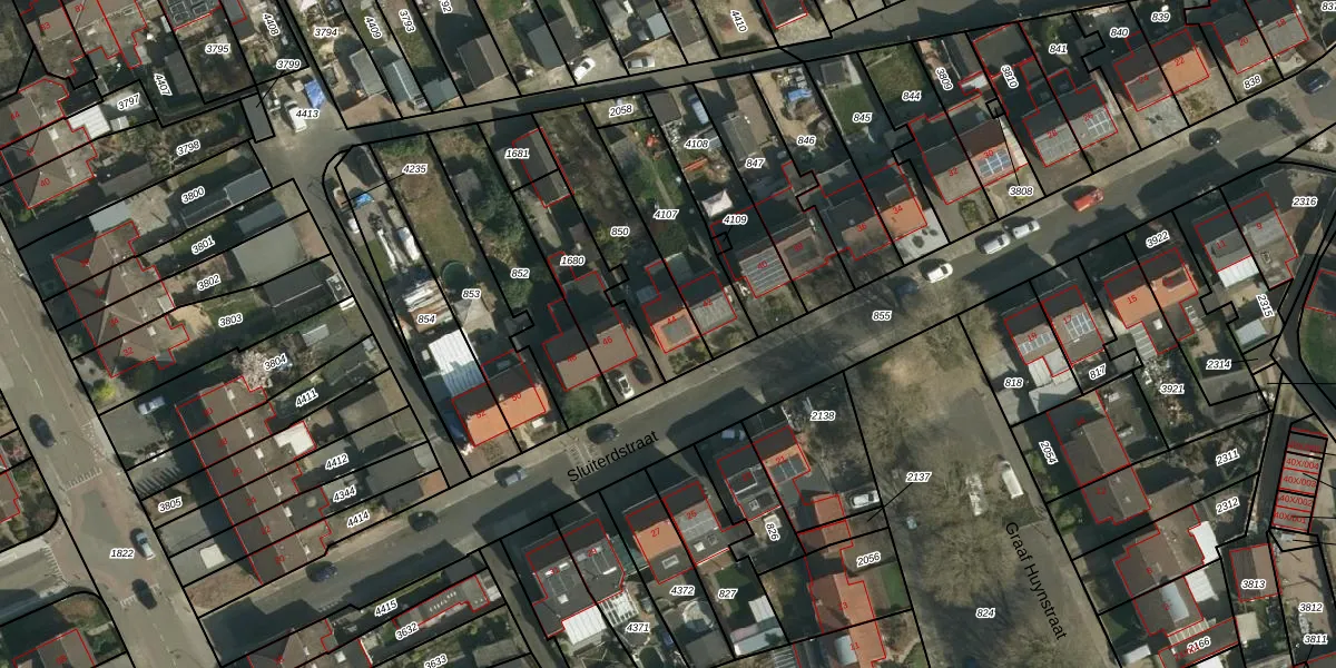 Het perceel waarop Sluiterdstraat 44 staat heeft een oppervlakte van 353 m². Dit is een groot perceel. De perceeloppervlakte wordt geregistreerd door het Kadaster. Gedetailleerde informatie over de maten van dit perceel kunt u vinden in het rapport Kadastrale kaart met maatvoering van Sluiterdstraat 44.