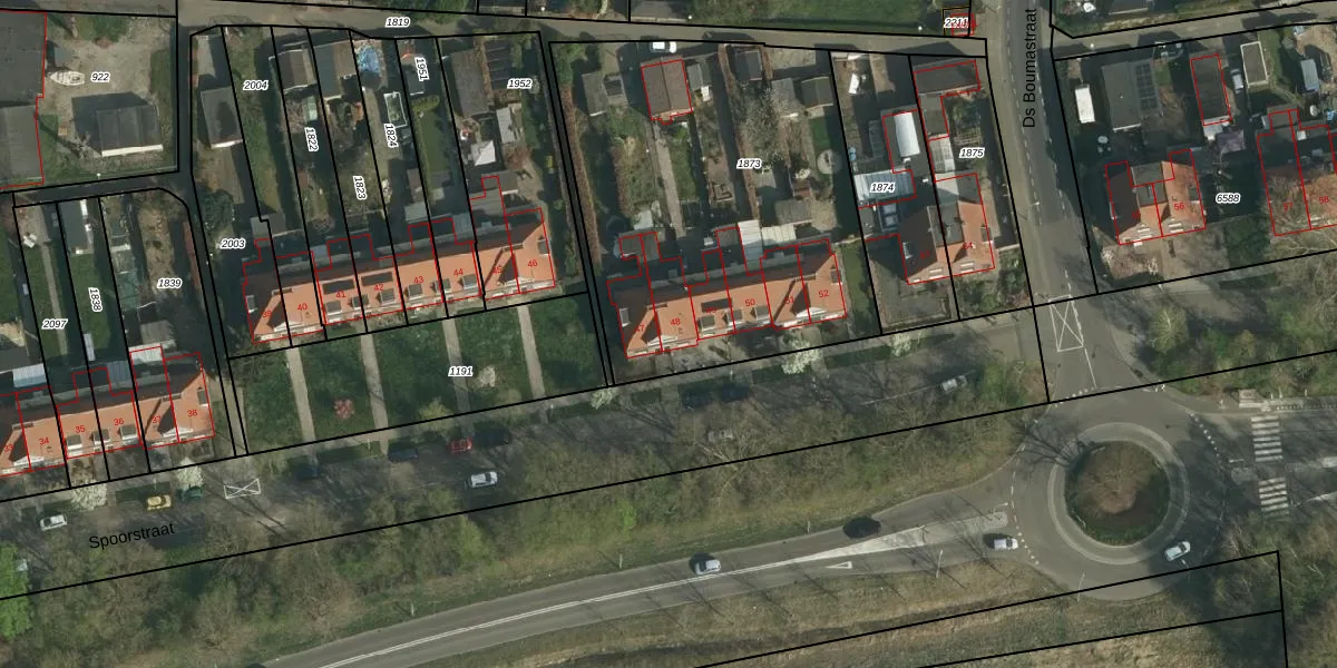 Het perceel waarop Spoorstraat 48 staat heeft een oppervlakte van 1970 m². Dit is een zeer groot perceel. De perceeloppervlakte wordt geregistreerd door het Kadaster. Gedetailleerde informatie over de maten van dit perceel kunt u vinden in het rapport Kadastrale kaart met maatvoering van Spoorstraat 48.