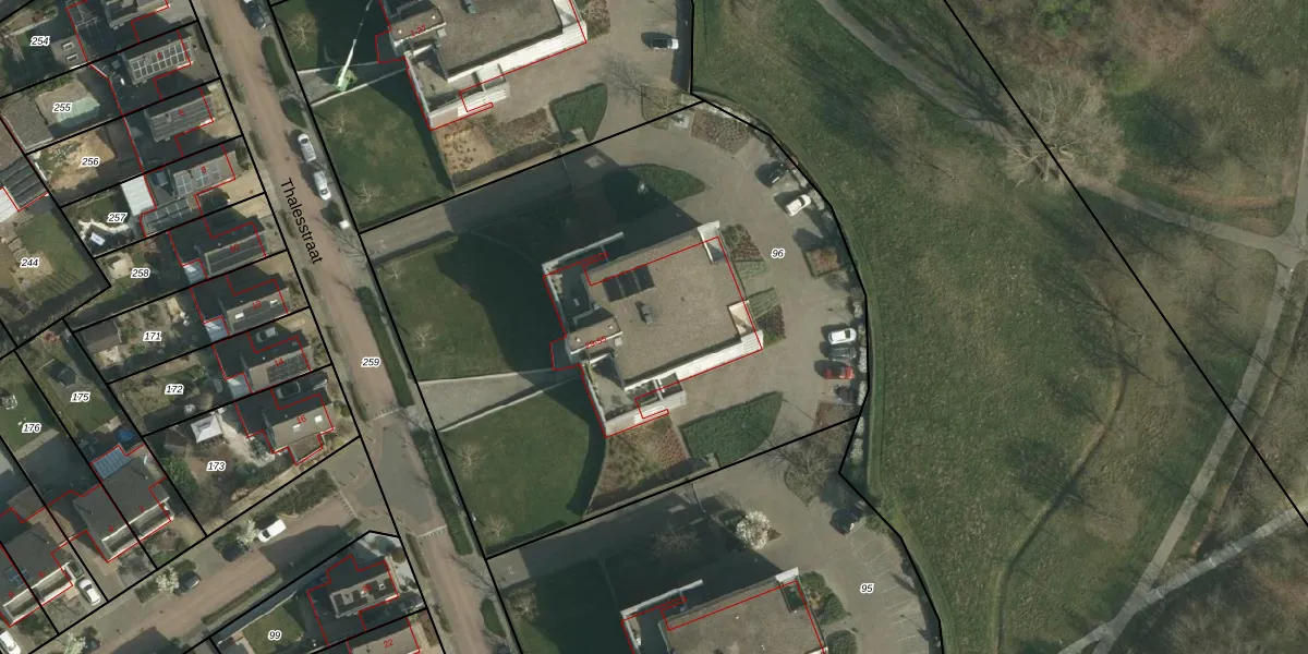 Het perceel waarop Thalesstraat 41 staat heeft een oppervlakte van 3523 m². Dit is een zeer groot perceel. De perceeloppervlakte wordt geregistreerd door het Kadaster. Gedetailleerde informatie over de maten van dit perceel kunt u vinden in het rapport Kadastrale kaart met maatvoering van Thalesstraat 41.