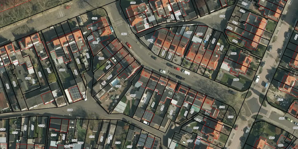 Het perceel waarop Torenstraat 83 staat heeft een oppervlakte van 370 m². Dit is een groot perceel. De perceeloppervlakte wordt geregistreerd door het Kadaster. Gedetailleerde informatie over de maten van dit perceel kunt u vinden in het rapport Kadastrale kaart met maatvoering van Torenstraat 83.