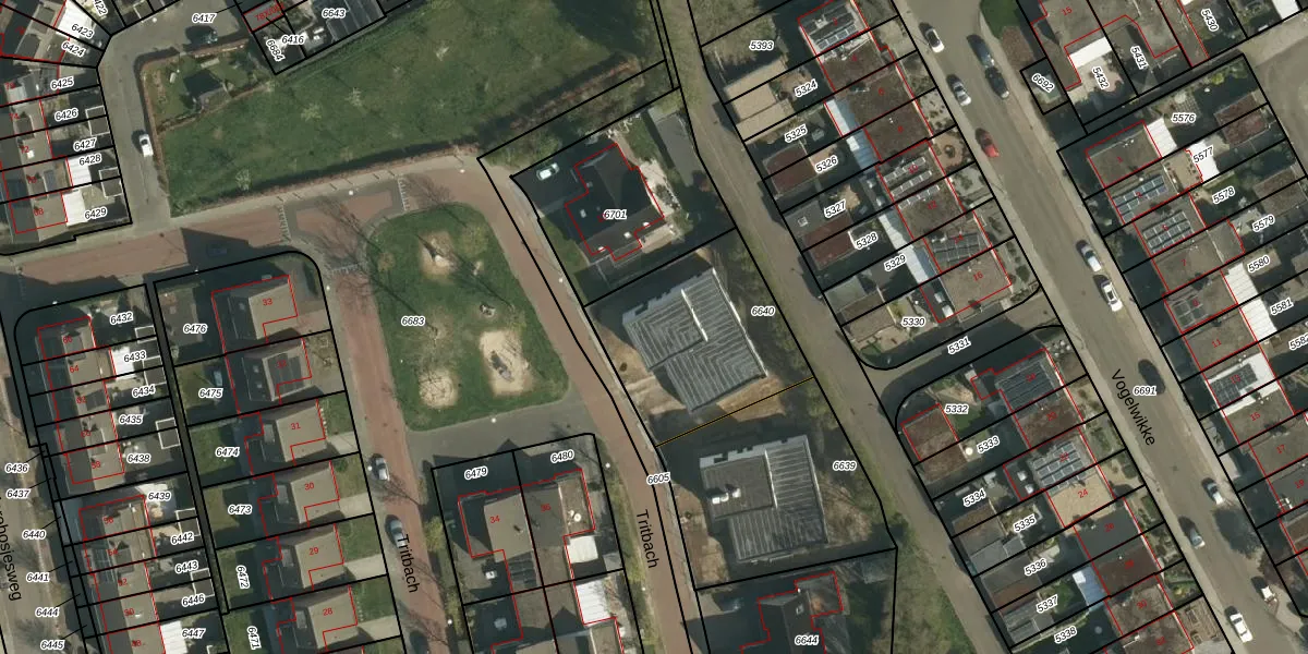 Het perceel waarop Tritbach 13 staat heeft een oppervlakte van 647 m². Dit is een groot perceel. De perceeloppervlakte wordt geregistreerd door het Kadaster. Gedetailleerde informatie over de maten van dit perceel kunt u vinden in het rapport Kadastrale kaart met maatvoering van Tritbach 13.