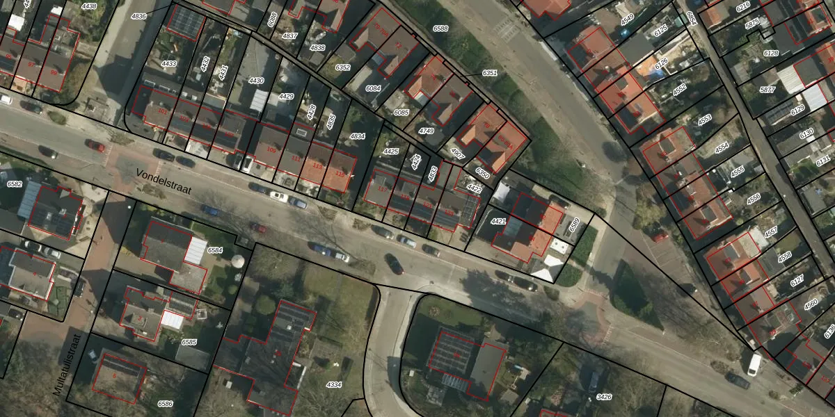 Vondelstraat 121 is gelegen op kadastraal perceel BSM02B4833. Deze kadastrale aanduiding is uniek en wordt gebruikt door het Kadaster om eigendomsrechten en andere zakelijke rechten vast te leggen. Het perceel maakt onderdeel uit van de kadastrale gemeente Brunssum.