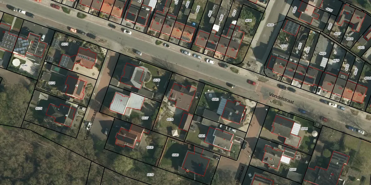 Het perceel waarop Vondelstraat 48 staat heeft een oppervlakte van 621 m². Dit is een groot perceel. De perceeloppervlakte wordt geregistreerd door het Kadaster. Gedetailleerde informatie over de maten van dit perceel kunt u vinden in het rapport Kadastrale kaart met maatvoering van Vondelstraat 48.