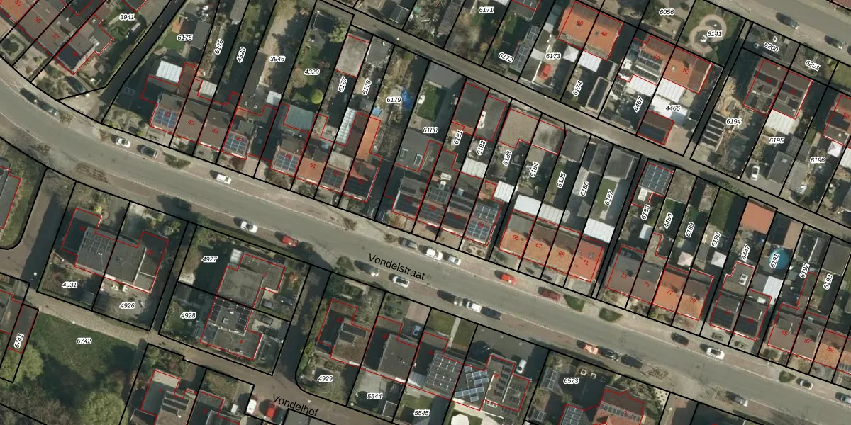 Het perceel waarop Vondelstraat 59 staat heeft een oppervlakte van 226 m². Dit is een middelgroot perceel. De perceeloppervlakte wordt geregistreerd door het Kadaster. Gedetailleerde informatie over de maten van dit perceel kunt u vinden in het rapport Kadastrale kaart met maatvoering van Vondelstraat 59.