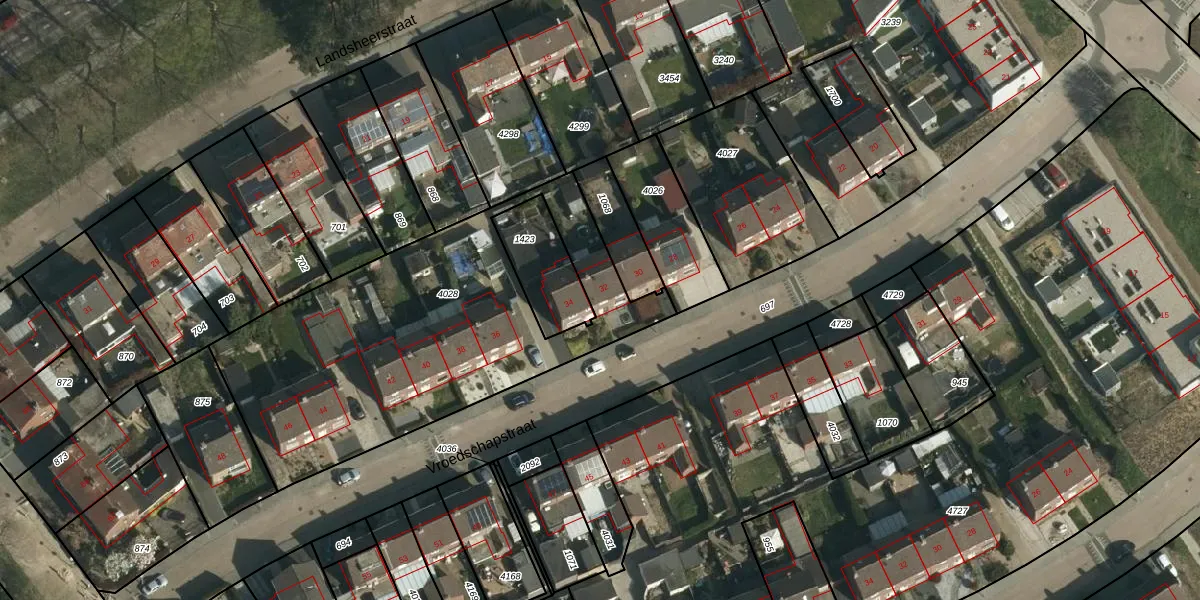 Het perceel waarop Vroedschapstraat 32 staat heeft een oppervlakte van 1722 m². Dit is een zeer groot perceel. De perceeloppervlakte wordt geregistreerd door het Kadaster. Gedetailleerde informatie over de maten van dit perceel kunt u vinden in het rapport Kadastrale kaart met maatvoering van Vroedschapstraat 32.