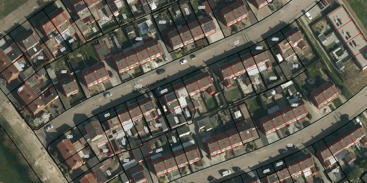 Het perceel waarop Vroedschapstraat 45 staat heeft een oppervlakte van 157 m². Dit is een middelgroot perceel. De perceeloppervlakte wordt geregistreerd door het Kadaster. Gedetailleerde informatie over de maten van dit perceel kunt u vinden in het rapport Kadastrale kaart met maatvoering van Vroedschapstraat 45.