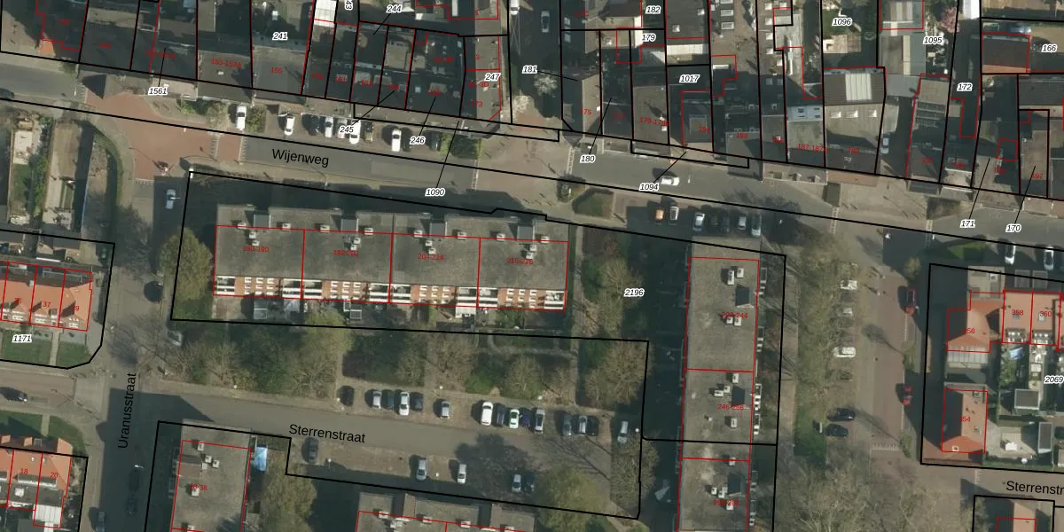 Het perceel waarop Wijenweg 226 staat heeft een oppervlakte van 3090 m². Dit is een zeer groot perceel. De perceeloppervlakte wordt geregistreerd door het Kadaster. Gedetailleerde informatie over de maten van dit perceel kunt u vinden in het rapport Kadastrale kaart met maatvoering van Wijenweg 226.