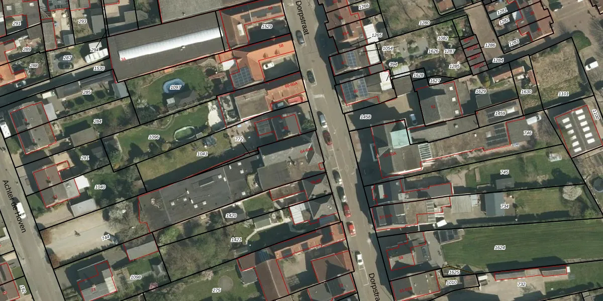 Het perceel waarop Dorpstraat 64-B staat heeft een oppervlakte van 1290 m². Dit is een zeer groot perceel. De perceeloppervlakte wordt geregistreerd door het Kadaster. Gedetailleerde informatie over de maten van dit perceel kunt u vinden in het rapport Kadastrale kaart met maatvoering van Dorpstraat 64-B.