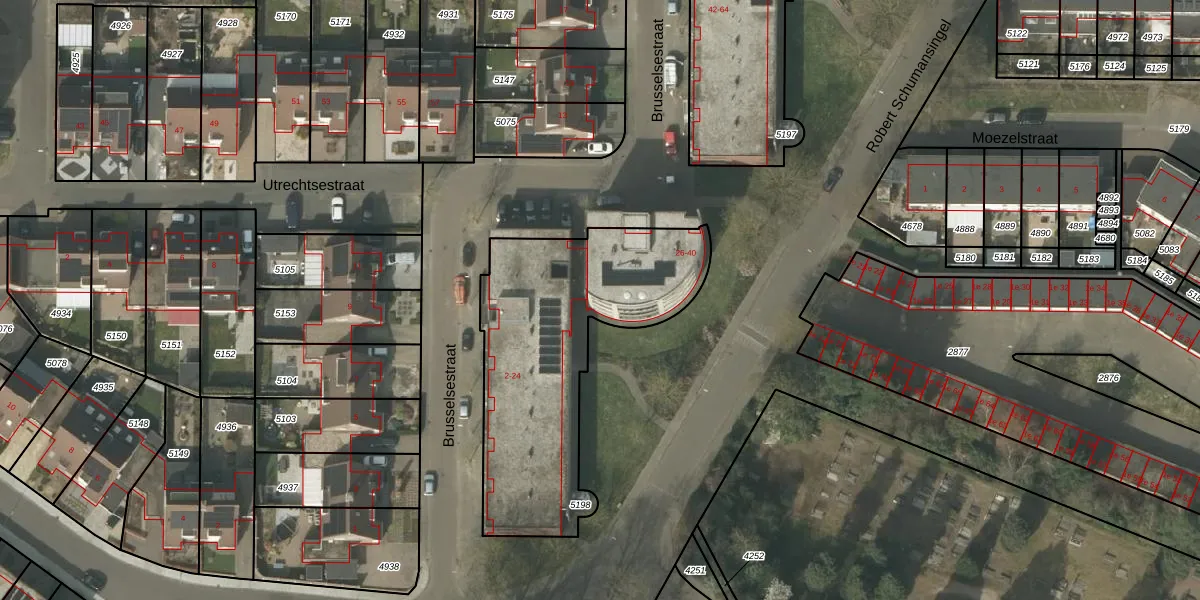 Brusselsestraat 40 is gelegen op kadastraal perceel BDL02F5198. Deze kadastrale aanduiding is uniek en wordt gebruikt door het Kadaster om eigendomsrechten en andere zakelijke rechten vast te leggen. Het perceel maakt onderdeel uit van de kadastrale gemeente Budel.