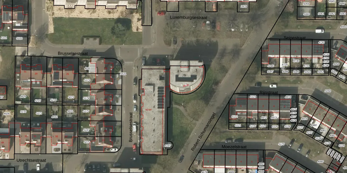 Het perceel waarop Brusselsestraat 68 staat heeft een oppervlakte van 1130 m². Dit is een zeer groot perceel. De perceeloppervlakte wordt geregistreerd door het Kadaster. Gedetailleerde informatie over de maten van dit perceel kunt u vinden in het rapport Kadastrale kaart met maatvoering van Brusselsestraat 68.