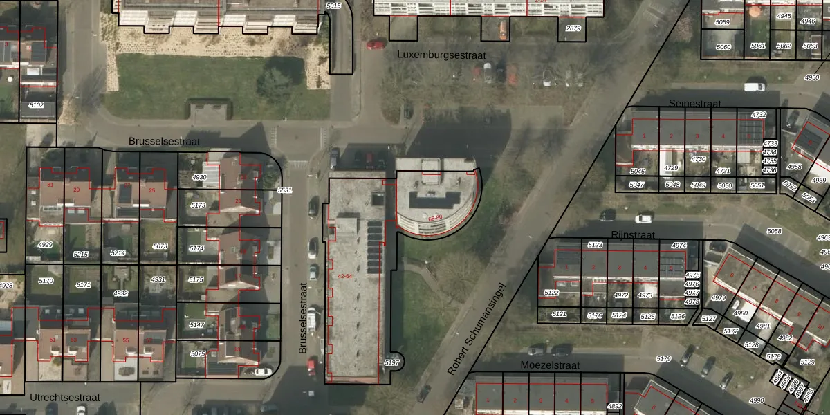 Het perceel waarop Brusselsestraat 72 staat heeft een oppervlakte van 1130 m². Dit is een zeer groot perceel. De perceeloppervlakte wordt geregistreerd door het Kadaster. Gedetailleerde informatie over de maten van dit perceel kunt u vinden in het rapport Kadastrale kaart met maatvoering van Brusselsestraat 72.