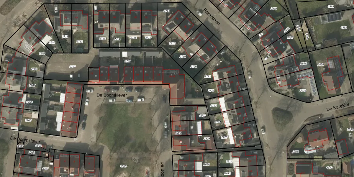 Het perceel waarop De Boomklever 33 staat heeft een oppervlakte van 1975 m². Dit is een zeer groot perceel. De perceeloppervlakte wordt geregistreerd door het Kadaster. Gedetailleerde informatie over de maten van dit perceel kunt u vinden in het rapport Kadastrale kaart met maatvoering van De Boomklever 33.