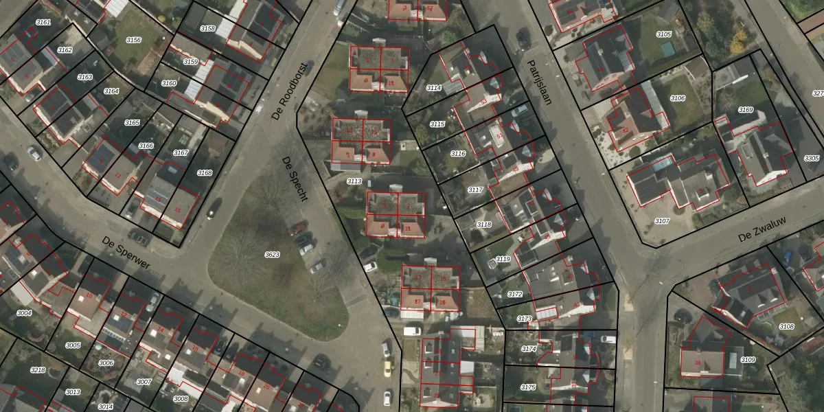 Het perceel waarop De Specht 7 staat heeft een oppervlakte van 3550 m². Dit is een zeer groot perceel. De perceeloppervlakte wordt geregistreerd door het Kadaster. Gedetailleerde informatie over de maten van dit perceel kunt u vinden in het rapport Kadastrale kaart met maatvoering van De Specht 7.