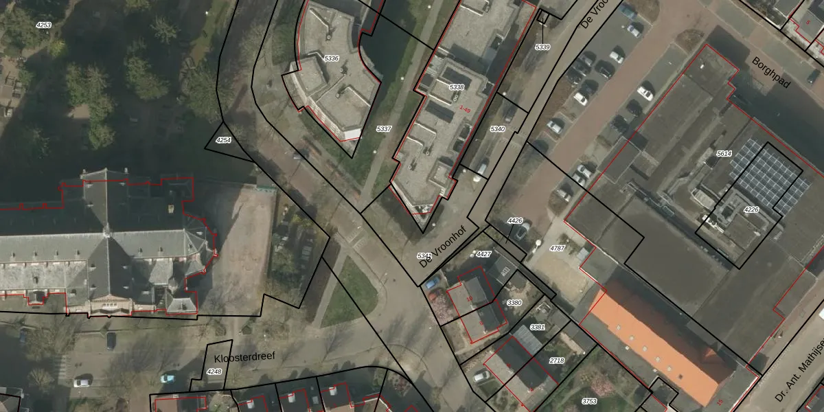 Het perceel waarop De Vroonhof 15 staat heeft een oppervlakte van 1094 m². Dit is een zeer groot perceel. De perceeloppervlakte wordt geregistreerd door het Kadaster. Gedetailleerde informatie over de maten van dit perceel kunt u vinden in het rapport Kadastrale kaart met maatvoering van De Vroonhof 15.