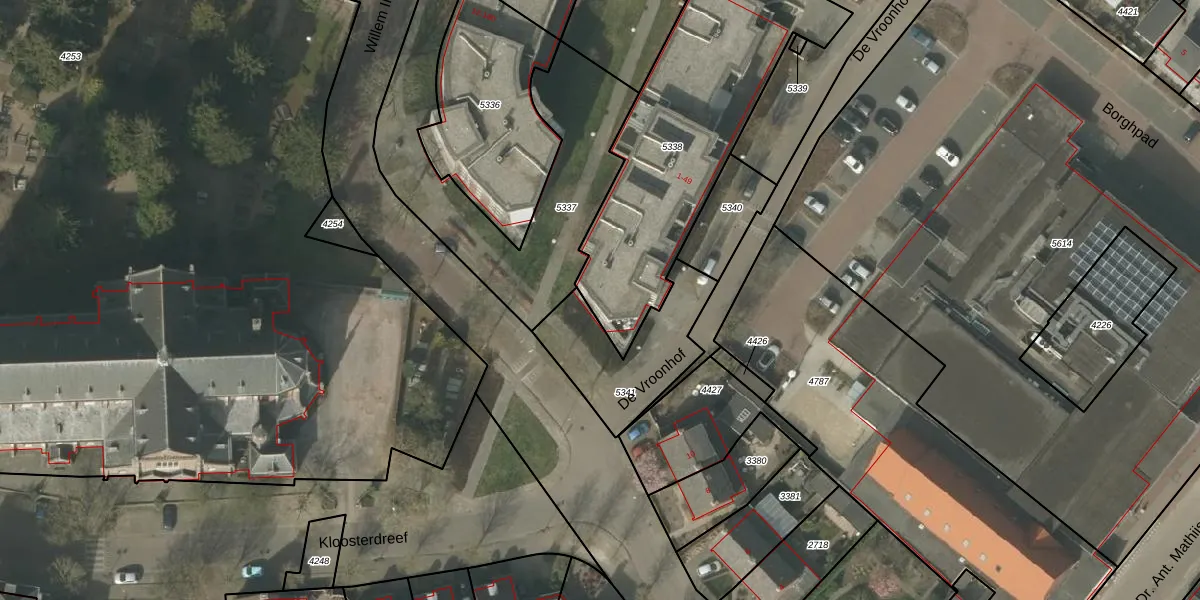 Het perceel waarop De Vroonhof 29 staat heeft een oppervlakte van 1094 m². Dit is een zeer groot perceel. De perceeloppervlakte wordt geregistreerd door het Kadaster. Gedetailleerde informatie over de maten van dit perceel kunt u vinden in het rapport Kadastrale kaart met maatvoering van De Vroonhof 29.