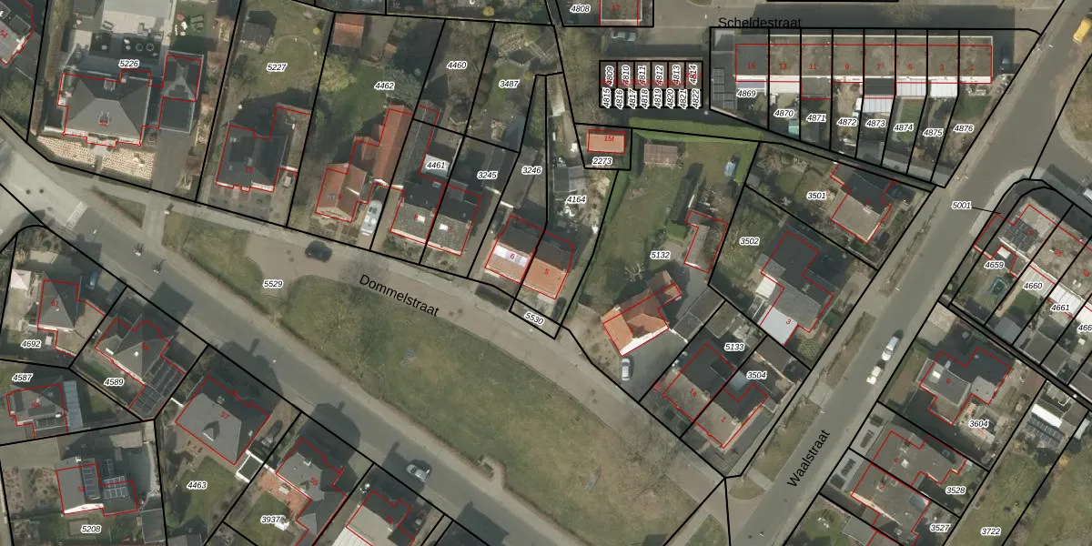 Dommelstraat 5 is gelegen op kadastraal perceel BDL02F4164. Deze kadastrale aanduiding is uniek en wordt gebruikt door het Kadaster om eigendomsrechten en andere zakelijke rechten vast te leggen. Het perceel maakt onderdeel uit van de kadastrale gemeente Budel.