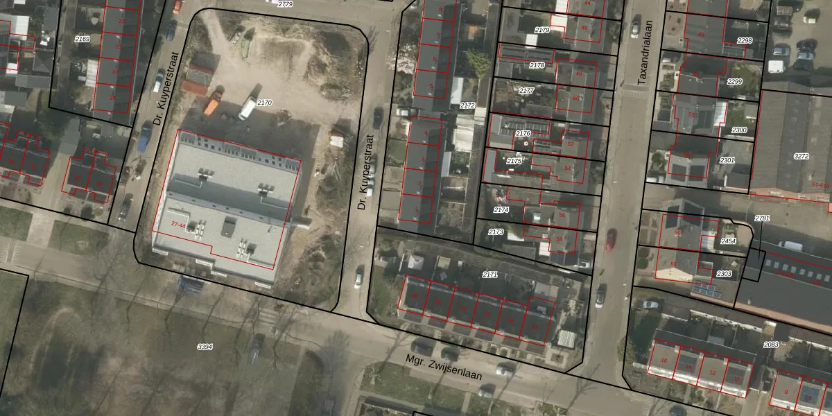 Dr. Kuyperstraat 1 is gelegen op kadastraal perceel BDL02C2172. Deze kadastrale aanduiding is uniek en wordt gebruikt door het Kadaster om eigendomsrechten en andere zakelijke rechten vast te leggen. Het perceel maakt onderdeel uit van de kadastrale gemeente Budel.