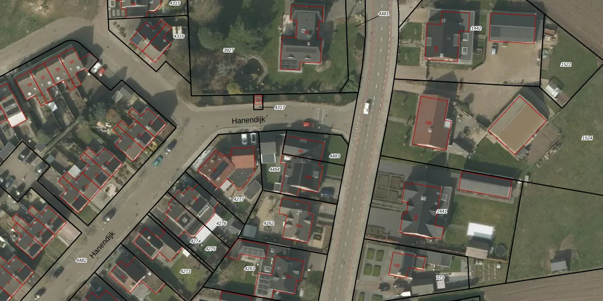 Hanendijk 18 is gelegen op kadastraal perceel BDL02F4483. Deze kadastrale aanduiding is uniek en wordt gebruikt door het Kadaster om eigendomsrechten en andere zakelijke rechten vast te leggen. Het perceel maakt onderdeel uit van de kadastrale gemeente Budel.