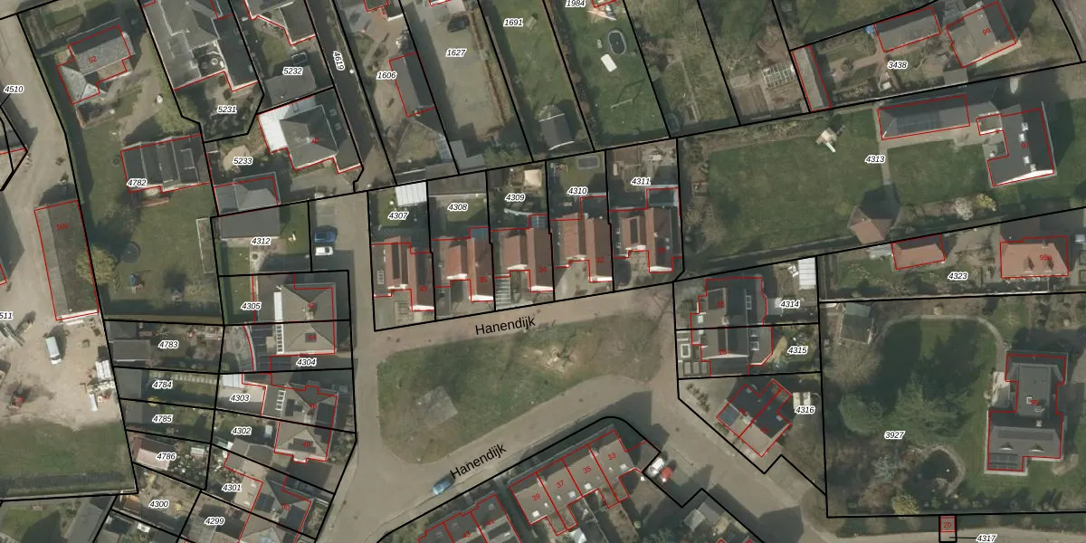 Het perceel waarop Hanendijk 34 staat heeft een oppervlakte van 287 m². Dit is een middelgroot perceel. De perceeloppervlakte wordt geregistreerd door het Kadaster. Gedetailleerde informatie over de maten van dit perceel kunt u vinden in het rapport Kadastrale kaart met maatvoering van Hanendijk 34.