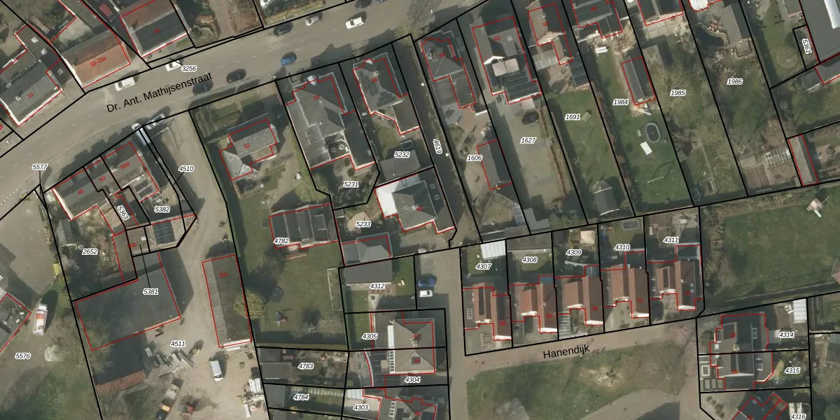 Hanendijk 40 is gelegen op kadastraal perceel BDL02F5233. Deze kadastrale aanduiding is uniek en wordt gebruikt door het Kadaster om eigendomsrechten en andere zakelijke rechten vast te leggen. Het perceel maakt onderdeel uit van de kadastrale gemeente Budel.
