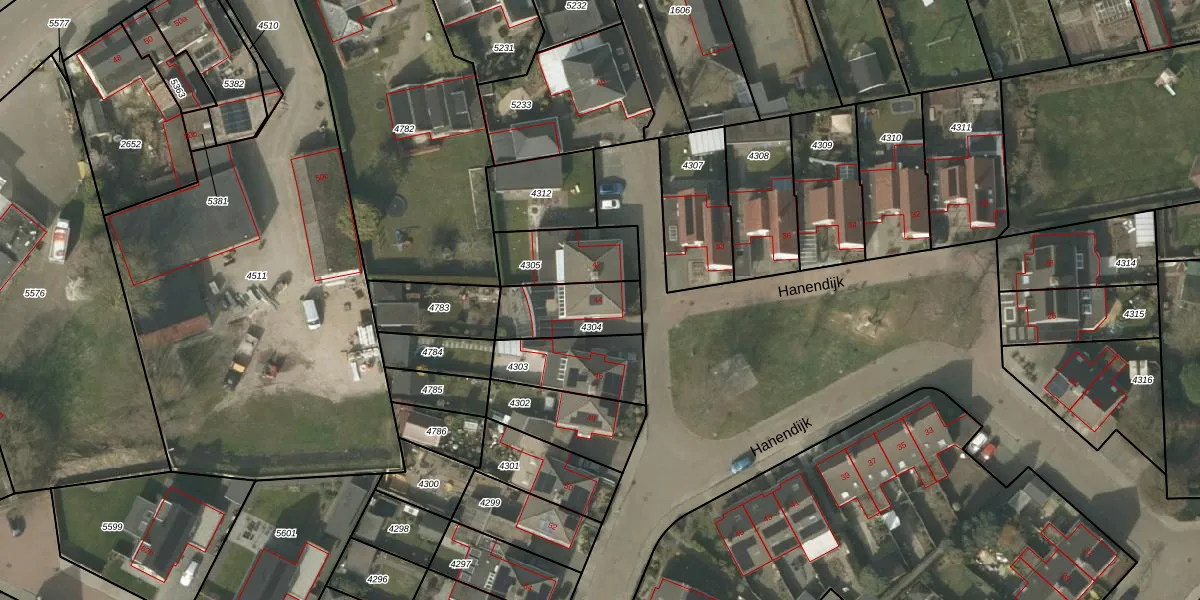 Hanendijk 44 is gelegen op kadastraal perceel BDL02F4304. Deze kadastrale aanduiding is uniek en wordt gebruikt door het Kadaster om eigendomsrechten en andere zakelijke rechten vast te leggen. Het perceel maakt onderdeel uit van de kadastrale gemeente Budel.