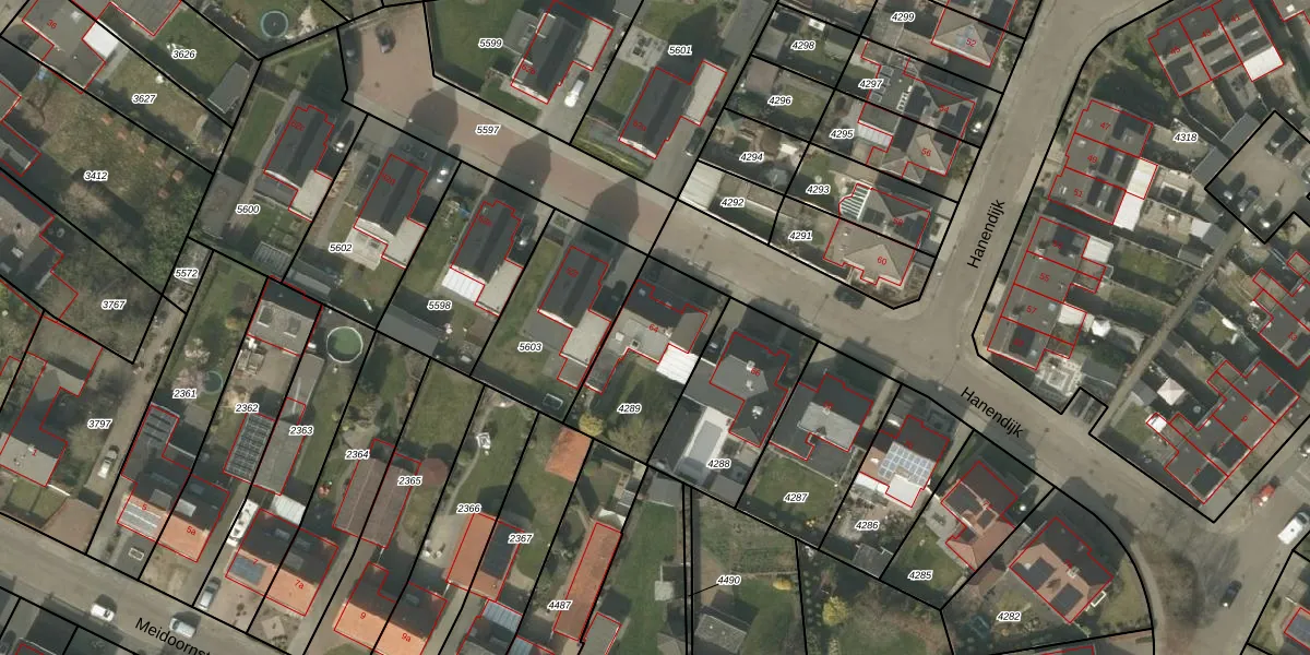 Het perceel waarop Hanendijk 64 staat heeft een oppervlakte van 405 m². Dit is een groot perceel. De perceeloppervlakte wordt geregistreerd door het Kadaster. Gedetailleerde informatie over de maten van dit perceel kunt u vinden in het rapport Kadastrale kaart met maatvoering van Hanendijk 64.