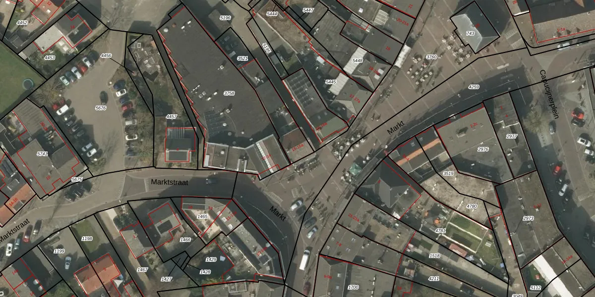 Het perceel waarop Markt 15 staat heeft een oppervlakte van 376 m². Dit is een groot perceel. De perceeloppervlakte wordt geregistreerd door het Kadaster. Gedetailleerde informatie over de maten van dit perceel kunt u vinden in het rapport Kadastrale kaart met maatvoering van Markt 15.