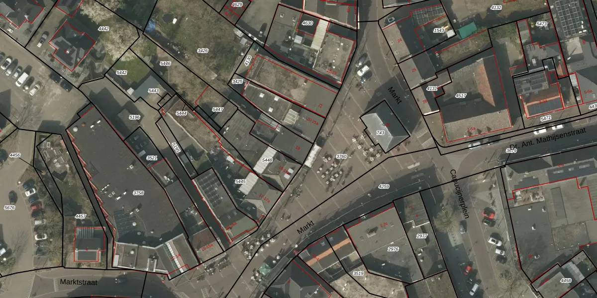 Het perceel waarop Markt 19 staat heeft een oppervlakte van 1021 m². Dit is een zeer groot perceel. De perceeloppervlakte wordt geregistreerd door het Kadaster. Gedetailleerde informatie over de maten van dit perceel kunt u vinden in het rapport Kadastrale kaart met maatvoering van Markt 19.
