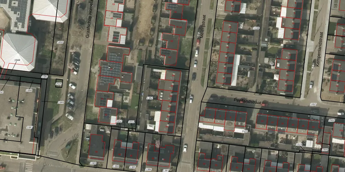 Het perceel waarop Meierijstraat 56 staat heeft een oppervlakte van 1063 m². Dit is een zeer groot perceel. De perceeloppervlakte wordt geregistreerd door het Kadaster. Gedetailleerde informatie over de maten van dit perceel kunt u vinden in het rapport Kadastrale kaart met maatvoering van Meierijstraat 56.