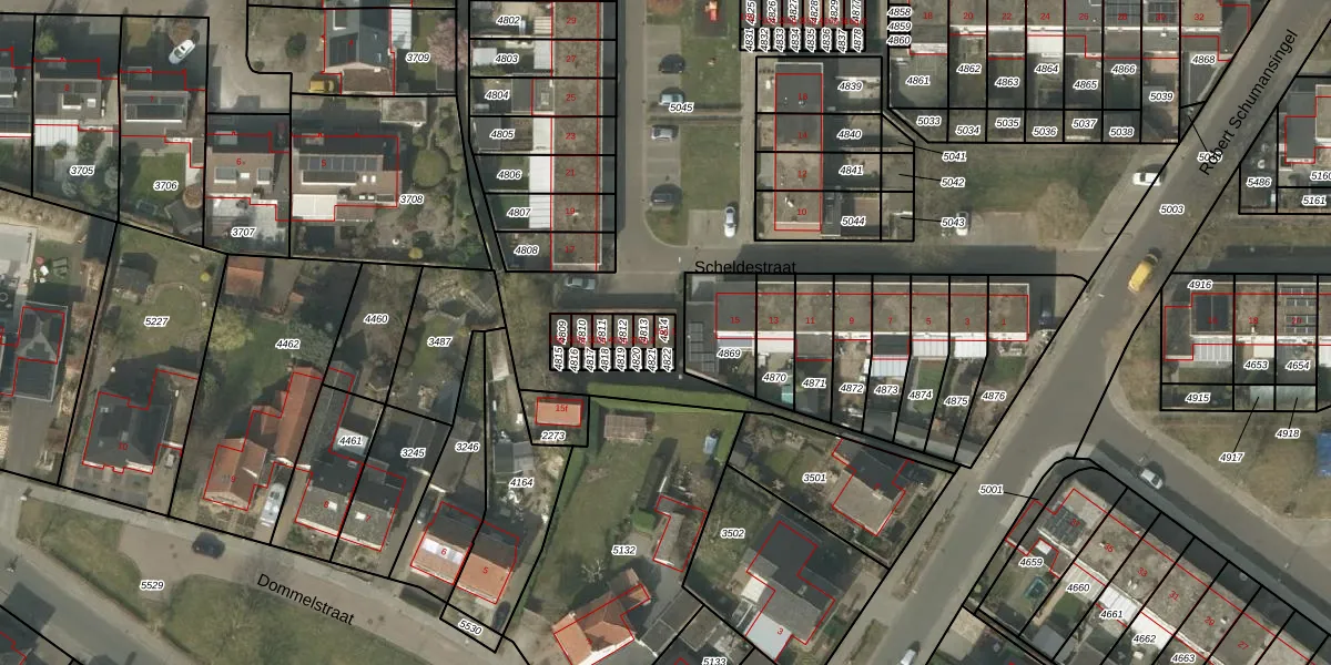 Scheldestraat 15-g-1 is gelegen op kadastraal perceel BDL02F4814. Deze kadastrale aanduiding is uniek en wordt gebruikt door het Kadaster om eigendomsrechten en andere zakelijke rechten vast te leggen. Het perceel maakt onderdeel uit van de kadastrale gemeente Budel.