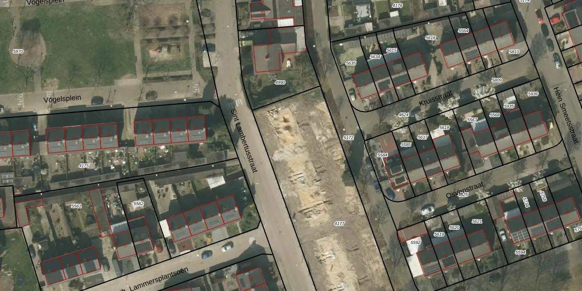 Het perceel waarop Sint Lambertusstraat 43 staat heeft een oppervlakte van 1981 m². Dit is een zeer groot perceel. De perceeloppervlakte wordt geregistreerd door het Kadaster. Gedetailleerde informatie over de maten van dit perceel kunt u vinden in het rapport Kadastrale kaart met maatvoering van Sint Lambertusstraat 43.