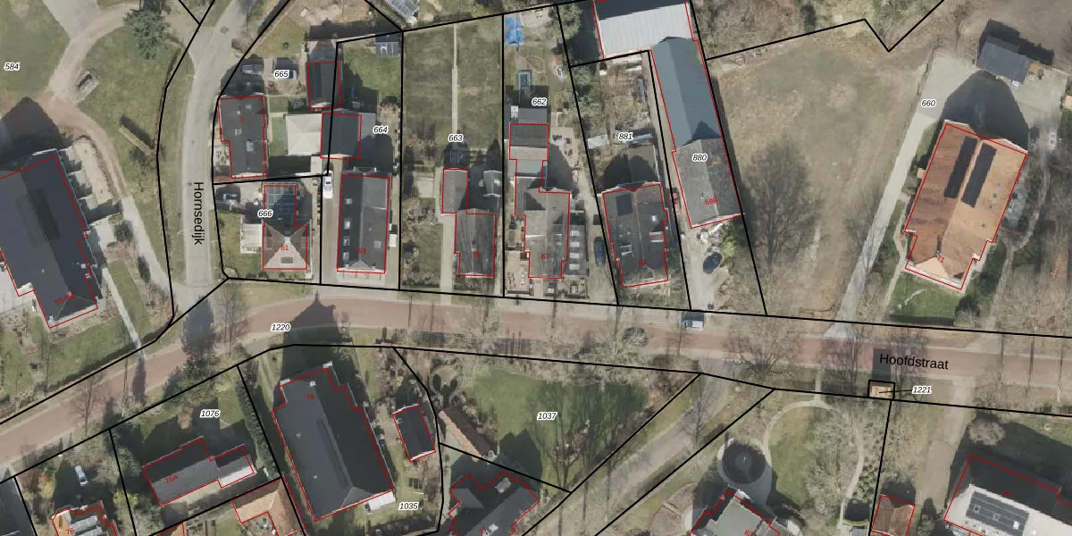 Het perceel waarop Hoofdstraat 67 staat heeft een oppervlakte van 860 m². Dit is een groot perceel. De perceeloppervlakte wordt geregistreerd door het Kadaster. Gedetailleerde informatie over de maten van dit perceel kunt u vinden in het rapport Kadastrale kaart met maatvoering van Hoofdstraat 67.