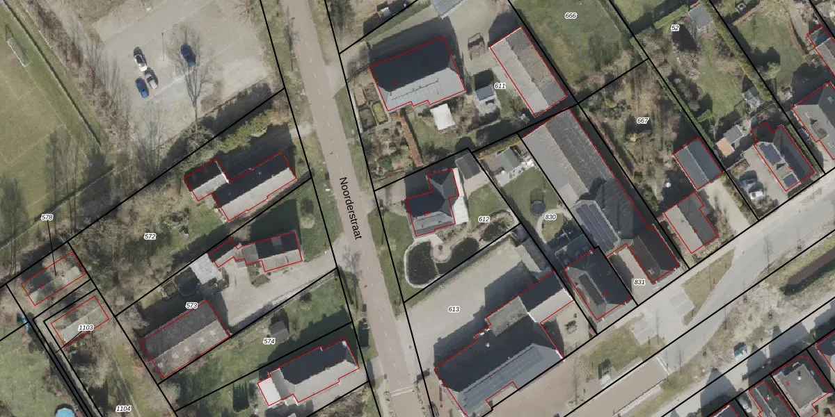 Het perceel waarop Noorderstraat 2-A staat heeft een oppervlakte van 715 m². Dit is een groot perceel. De perceeloppervlakte wordt geregistreerd door het Kadaster. Gedetailleerde informatie over de maten van dit perceel kunt u vinden in het rapport Kadastrale kaart met maatvoering van Noorderstraat 2-A.