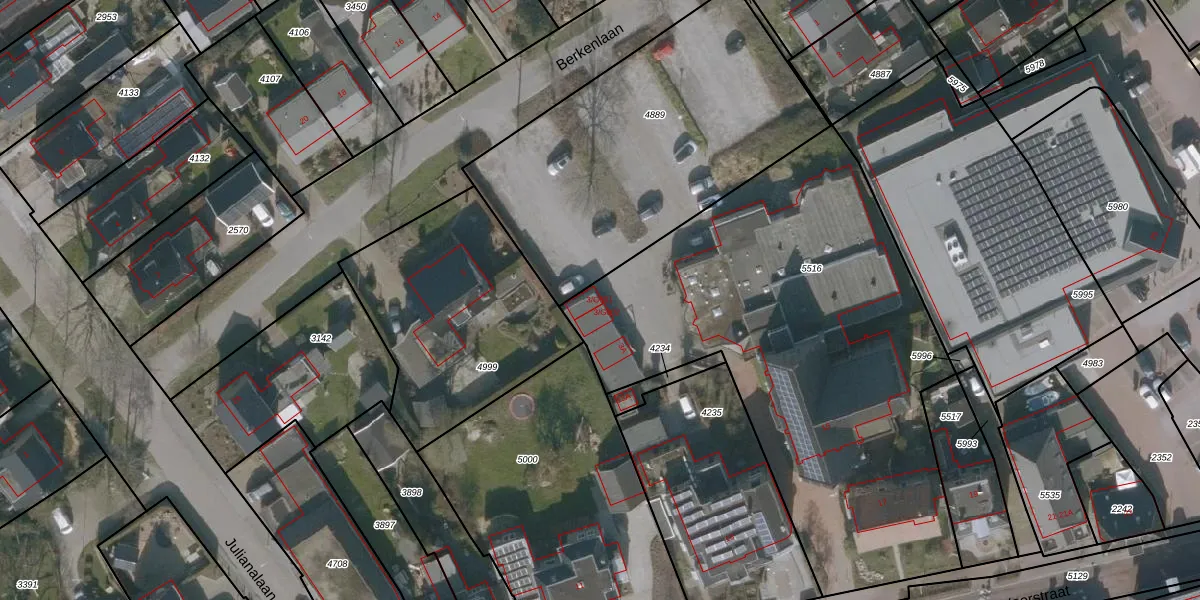 Het perceel waarop Berkenlaan 3-G001 staat heeft een oppervlakte van 2585 m². Dit is een zeer groot perceel. De perceeloppervlakte wordt geregistreerd door het Kadaster. Gedetailleerde informatie over de maten van dit perceel kunt u vinden in het rapport Kadastrale kaart met maatvoering van Berkenlaan 3-G001.