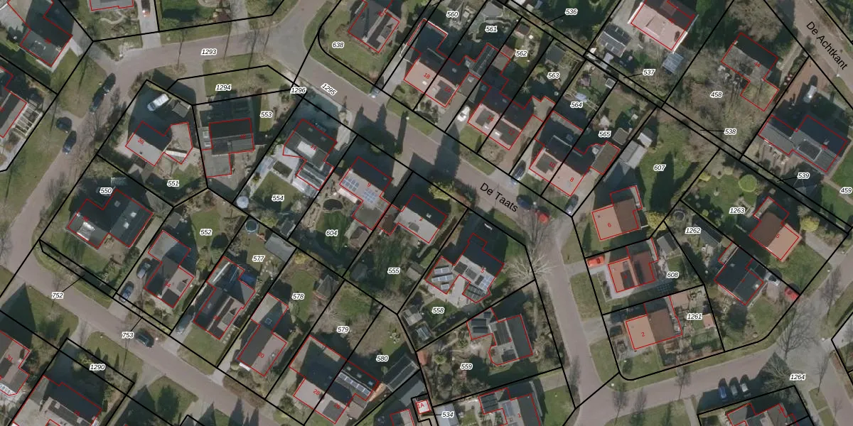 Het perceel waarop De Taats 7 staat heeft een oppervlakte van 467 m². Dit is een groot perceel. De perceeloppervlakte wordt geregistreerd door het Kadaster. Gedetailleerde informatie over de maten van dit perceel kunt u vinden in het rapport Kadastrale kaart met maatvoering van De Taats 7.