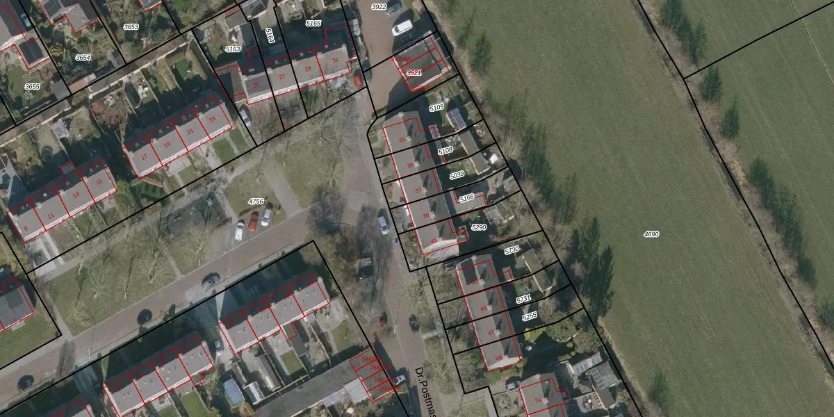 Dr.Postmastraat 39 is gelegen op kadastraal perceel BTP00A5166. Deze kadastrale aanduiding is uniek en wordt gebruikt door het Kadaster om eigendomsrechten en andere zakelijke rechten vast te leggen. Het perceel maakt onderdeel uit van de kadastrale gemeente Buitenpost.