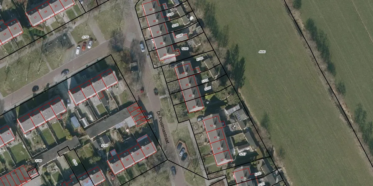 Het perceel waarop Dr.Postmastraat 47 staat heeft een oppervlakte van 210 m². Dit is een middelgroot perceel. De perceeloppervlakte wordt geregistreerd door het Kadaster. Gedetailleerde informatie over de maten van dit perceel kunt u vinden in het rapport Kadastrale kaart met maatvoering van Dr.Postmastraat 47.