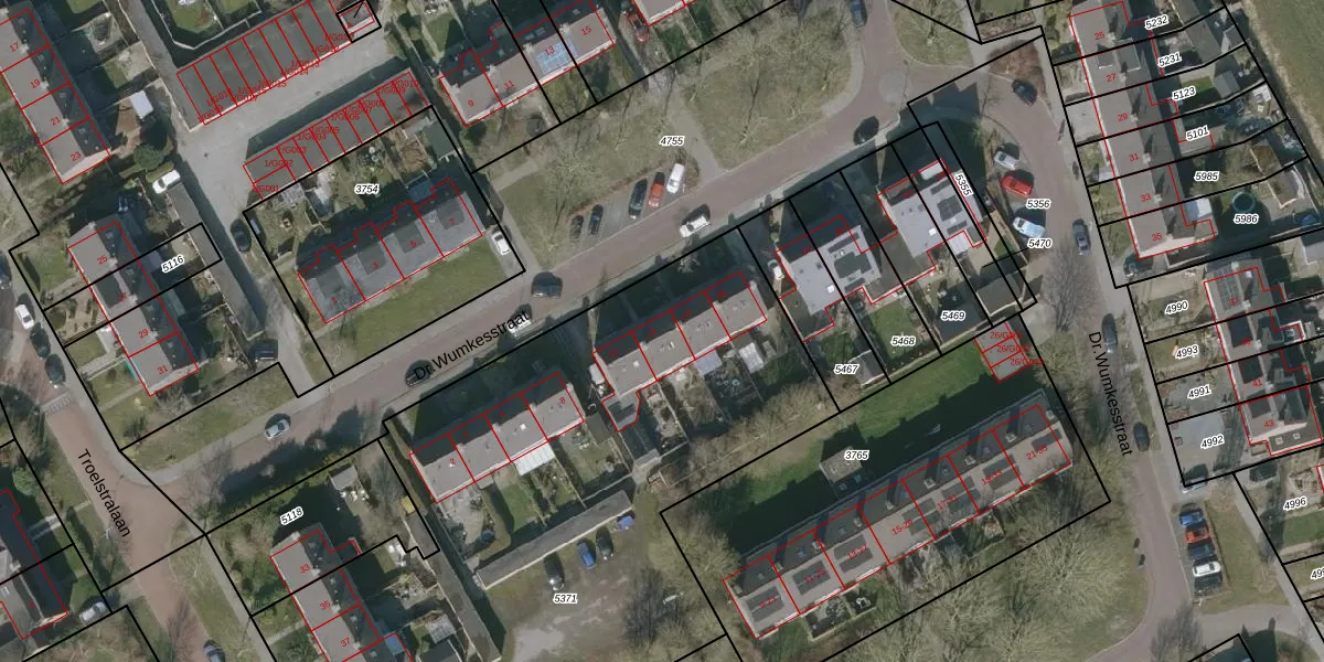 Het perceel waarop Dr.Wumkesstraat 12 staat heeft een oppervlakte van 4253 m². Dit is een zeer groot perceel. De perceeloppervlakte wordt geregistreerd door het Kadaster. Gedetailleerde informatie over de maten van dit perceel kunt u vinden in het rapport Kadastrale kaart met maatvoering van Dr.Wumkesstraat 12.