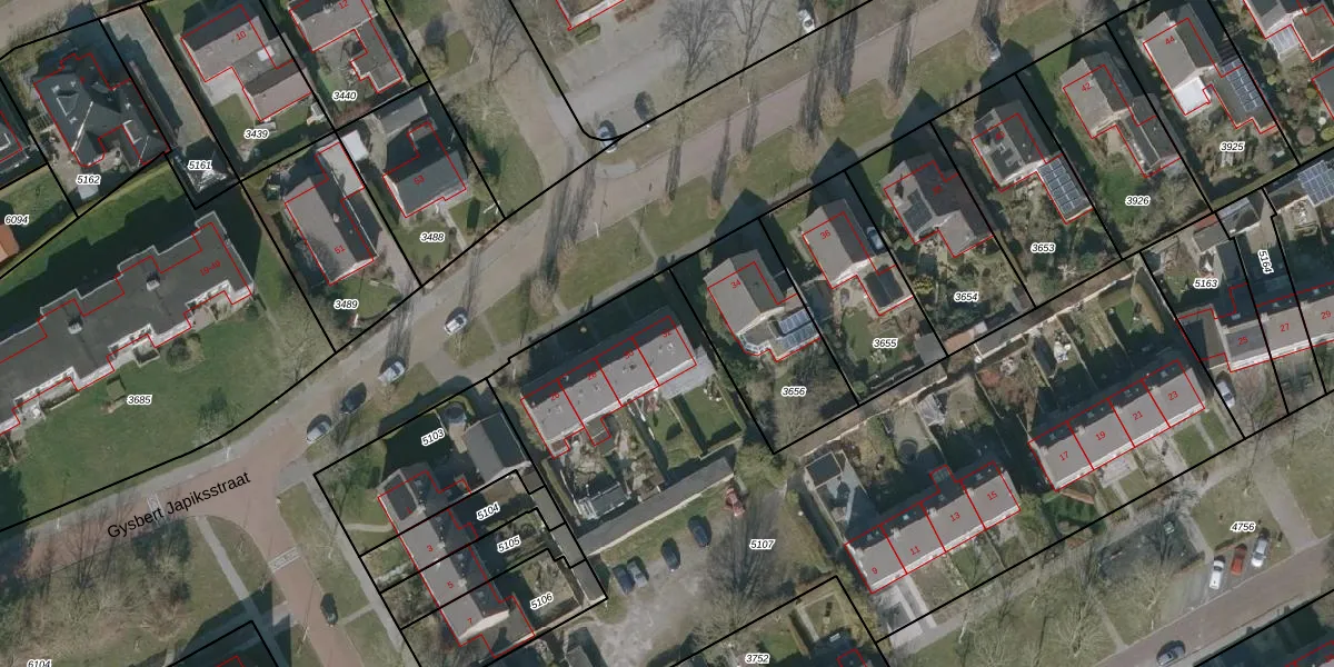 Het perceel waarop Gysbert Japiksstraat 32 staat heeft een oppervlakte van 4999 m². Dit is een zeer groot perceel. De perceeloppervlakte wordt geregistreerd door het Kadaster. Gedetailleerde informatie over de maten van dit perceel kunt u vinden in het rapport Kadastrale kaart met maatvoering van Gysbert Japiksstraat 32.