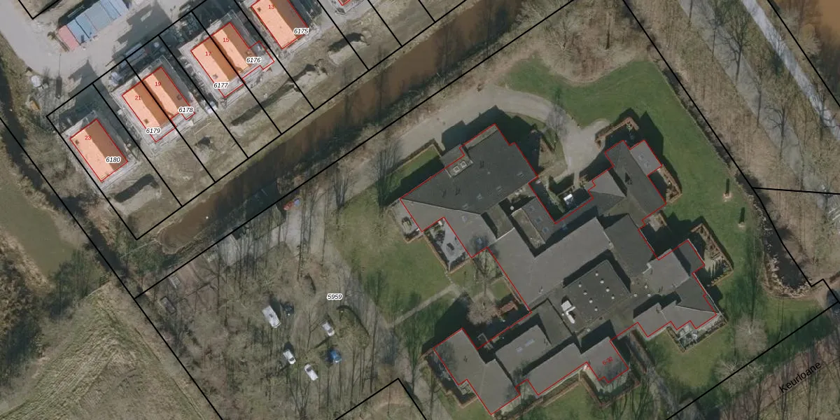 Het perceel waarop Keurloane 18 staat heeft een oppervlakte van 1,1 ha. Dit is een zeer groot perceel. De perceeloppervlakte wordt geregistreerd door het Kadaster. Gedetailleerde informatie over de maten van dit perceel kunt u vinden in het rapport Kadastrale kaart met maatvoering van Keurloane 18.