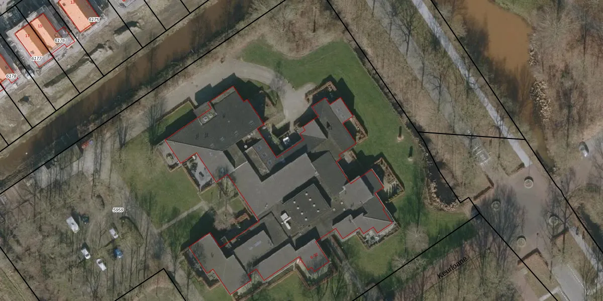 Het perceel waarop Keurloane 24 staat heeft een oppervlakte van 1,1 ha. Dit is een zeer groot perceel. De perceeloppervlakte wordt geregistreerd door het Kadaster. Gedetailleerde informatie over de maten van dit perceel kunt u vinden in het rapport Kadastrale kaart met maatvoering van Keurloane 24.